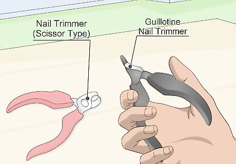Get nail trimmers. Every cat needs its nails trimmed once in awhile, so you should buy some nail trimmers in preparation for bringing a new cat home. Cat nail trimmers come in two types: guillotine type and a scissor type. The guillotine type are generally easier to use than the scissor type. You can also use human nail clippers to trim your cat's nails in a pinch. Trimming a cat's nails is good for the cat but it can also cut down on the damage they can do to your furniture when scratching.