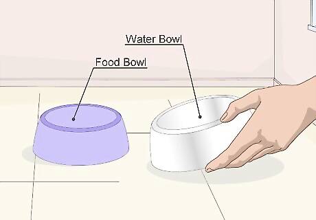 Get food and water containers. Your cat will need to have both a bowl for food and a bowl for water. These containers should be made of stainless steel, ceramic, or glass. These materials are the easiest to clean. There is no need to get special bowls made for pets. Instead, you can use bowls that you already own. However, know that pet bowls are usually heavier and weighted to the bottom, so that they are less easily tipped over. Cats prefer a water bowl that is spaced away from a food bowl. Avoid tandem bowls that have food in one half and water in the other. These can cause both the water and food to become soiled by one another.