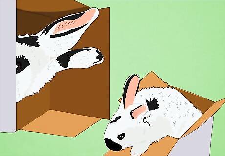 Give your rabbit a place to hide. Rabbits need a place to hide from things that scare them, so they feel safe and secure. Place a cardboard box or a nest box for your rabbit to do so. The hiding place should be placed somewhere where he can rapidly move underneath it or inside it, but be small enough to make the rabbit feel secure. The boxes should have holes at both ends so the rabbit will use it. You can place the hiding place boxes in "hidden" places in your house, like under furniture, in closets, or in corners of the room. If your rabbit has made a habit of using places for hiding spots you'd rather them not be, like under your bed, put a box there with multiple openings to keep the rabbit in the box and away from your carpet and bed frame. Make sure to have one hiding place per rabbit. The hiding place should be located away from sights and sounds that could scare your rabbit. Place the hiding place away from other animals, people, drafts, and sunlight. Make sure the hiding place is quiet. Cardboard boxes stuffed with hay make inexpensive chewing and hiding spots for rabbits.