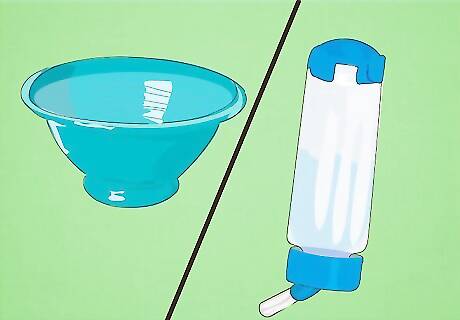 Provide water in a sipper bottle or a ceramic bowl. Sipper bottles are easier to keep clean than bowls, but rabbits prefer to drink from bowls. One of each could be provided to see which works best in your rabbit’s situation. Regardless of container used, clean it and put in fresh water at least once a day. If using a bowl, make sure it is heavy enough not to tip over.