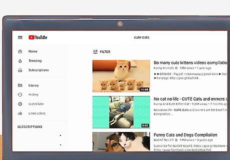 Watch cat videos online. Watching cat videos online is an excellent way to celebrate National Cat Day and to improve your mood. Cat videos give you a boost of energy, increase positive thoughts, and decrease negative feelings. Visit sites like Facebook, YouTube, Buzzfeed and I Can Has Cheezburger to view funny and cute cat videos, then share them with your friends and fellow cat fans on social media.