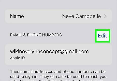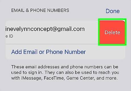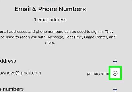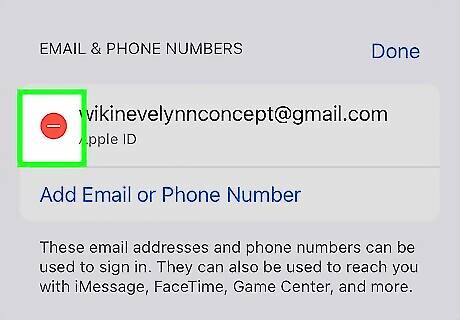 Tap Edit next to "Email & Phone Numbers". A red minus icon will appear next to your current Apple Account.