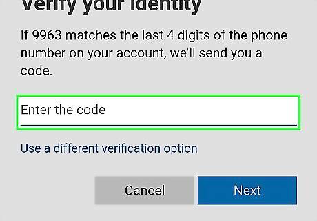 Enter the code. Type the code you retrieved from your email or phone in the text box into the middle of the page.
