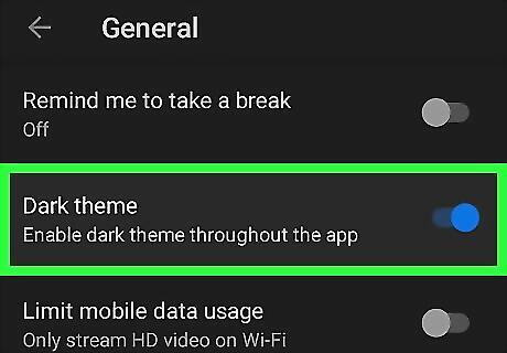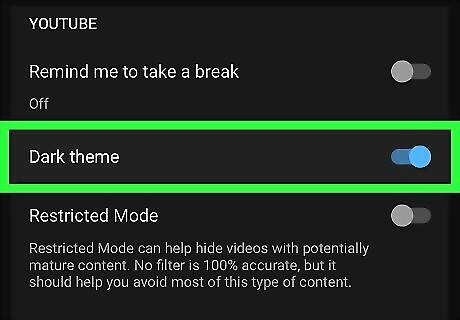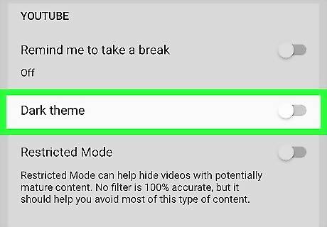 Slide the "Dark Theme" switch to Android 7 Switch Off to use standard theme. This restores the look of YouTube to the default theme of dark text on a white background.