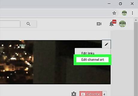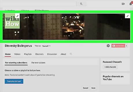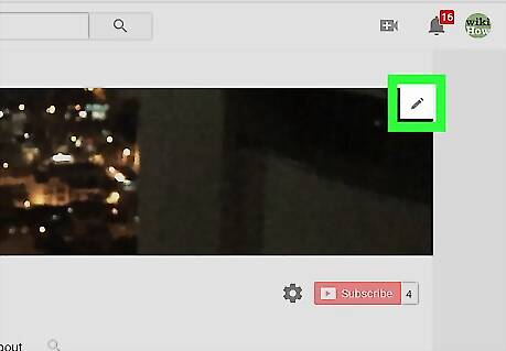 Hover the mouse cursor over the current channel art. A pencil icon will appear at the top-right corner. If you don't have a custom image at the top of the screen, hover the mouse over the gray diamond pattern (the default channel art).