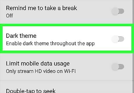 Slide the "DARK THEME" switch to Android 7 Switch Off to use the standard theme. This turns off the dark theme, restoring the look of YouTube to the default theme of dark text on a white background.