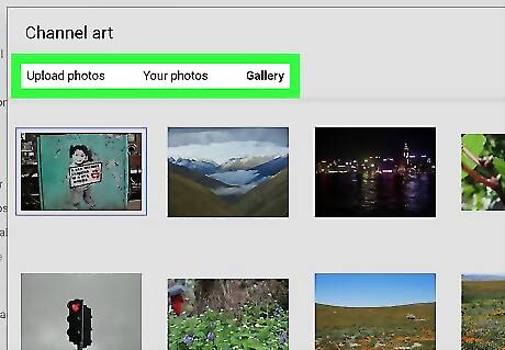 Select your channel art. Here's how: If the image is on your computer, click Upload photos at the top of the window, click Select a photo from your computer, select the image, and then click Open. If the image is saved to your Google Photos account, click Your photos at the top of the window, open the folder that contains the image, then click the image to select it. If the photo is saved to your YouTube photo gallery, click Gallery, then click the image to select it. If the photo is on your computer, click Upload photos.