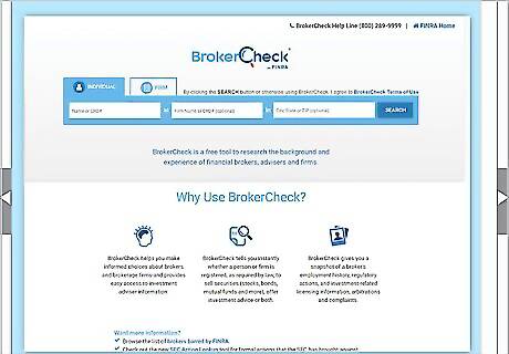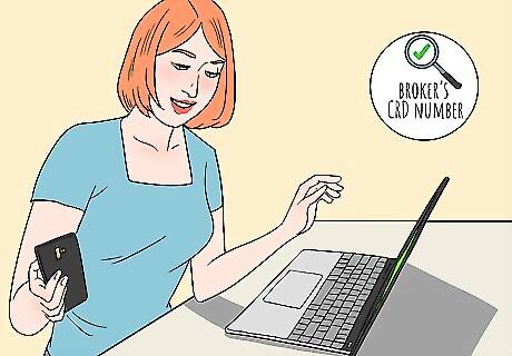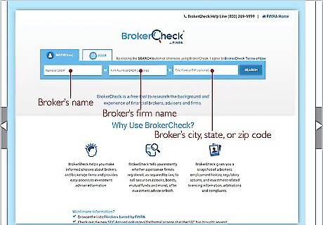 Call or email FINRA if you are unable to find what you need online. FINRA offers a BrokerCheck helpline in case you need assistance or additional information. If you can’t find a broker or don’t have Internet access, the helpline is your best bet for getting a broker’s background information. If you have Internet access, send an email to get your questions answered. Both services are available all the time. Call the BrokerCheck hotline by dialing 1-800-289-9999. Have the broker’s name or CRD number available. Having information about the broker’s firm or address also helps. To email FINRA, send a message to [email protected]. Include your question along with any relevant information like the broker’s name or CRD number.