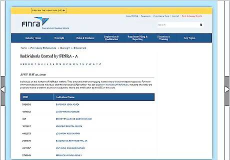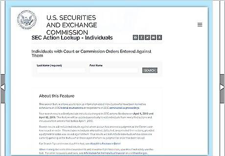 Use the SEC action lookup to see legal charges against a broker. The Securities And Exchange Commission (SEC) maintains a list of legal actions they take. The SEC’s job is to protect investors and maintain the securities markets, so if you see the broker’s name listed, they could be untrustworthy. Type in the broker’s name to begin the search. The lookup page is located at https://www.sec.gov/litigations/sec-action-look-up. The page lists only records from legal actions taken by the SEC, including barring brokers who break the rules. It doesn’t include customer complaints or decisions taken on a state level. The SEC list contains records on lots of people, not just licensed brokers. Use it to vet any individual or before letting them handle your money.