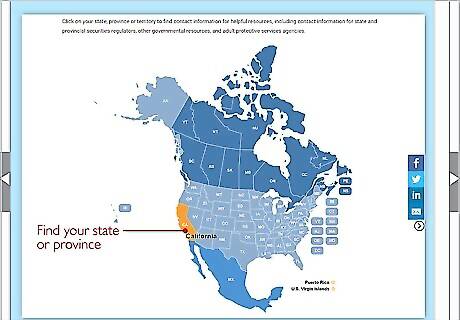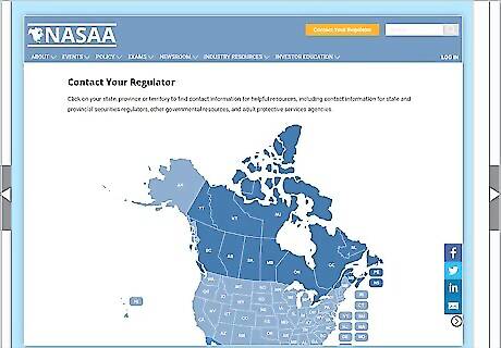 Locate the contact information for the security regulator in your area. Visit the North American Securities Administrators Association (NASAA) for a list of regulators. They are typically state finance agencies or attorney generals. Each area has a single regulating office. The list is available at http://www.nasaa.org/about-us/contact-us/contact-your-regulator/. The NASAA list covers regulators in the U.S. and Canada. If you live somewhere else, check your government’s securities and exchange department for more information.