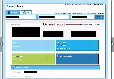 Click on the “Detailed Report” button for more information. The button is in the upper right part of the page underneath the search bar. It expands upon the information you saw in the summary, such as by showing more exact dates for when the broker passed a certification exam or registered to work for a company. The biggest advantage the detailed report has is that it provides more information about disclosures like complaints and disciplinary actions. In the disclosure section, click on the court case or arbitration case numbers. It opens up a FINRA page that details the dispute and even lets you see any relevant court documents if they are available.