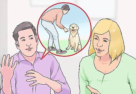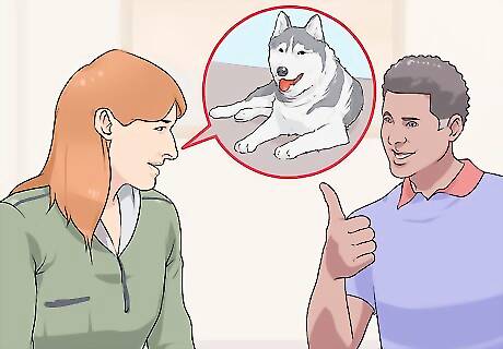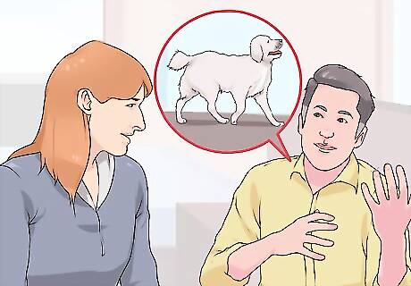 Listen to your spouse. Once you have told your spouse what you want in a dog, give him or her a chance to make the case for what they want. Since they have taken the time to listen to your desires, you should give them the opportunity to express their desires as well. Ask your spouse what they want. Say, "I've told you what I want to do with a dog. Now I would love to know what you look forward to doing with a dog." While your spouse is talking, pay attention and don't interrupt. You should take note, however, on what points you agree on and what you don't agree on.