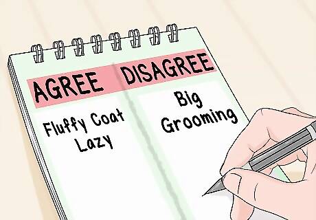 Make note of what you agree and disagree on. In some cases, you and your spouse will agree on what type of dog to get. However, it is more likely that you will agree on some things you want in a potential dog and disagree on others. To stay focused and make forward progress on your decision, make a list of what you agree and don't agree on. This will help you to focus on what needs to be discussed further. In order to know what you agree and don't agree on, you will need to start by making a list of all of the aspects of a dog that need to be decided on. This means things like size and coat length, as well as personality traits and temperament.