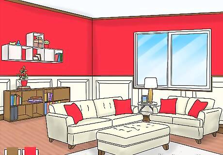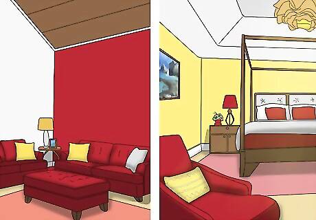 Paint with warm colors to create comfortable, energizing rooms. Warm colors include red, orange, and yellow. The brightest tints of these colors are bold and vibrant but can be too strong when used often. More muted shades can make a room feel cozier, similar to a summer or autumn day. Warm colors work well in rooms that feature a lot of activity, such as living rooms. For example, use a deep shade of red on your walls, then pair it with yellow and orange decorations. Your room will look playful, like a leaf pile in fall. Use bright tints of warm colors as an accent. A bright yellow, for instance, can lighten up a room, but using it sparingly prevents it from feeling overwhelming. You can also add subtle warmth to a room by painting it in shades of white lightly tinted with warm colors.