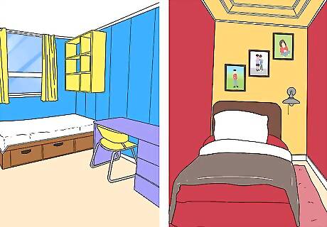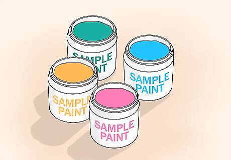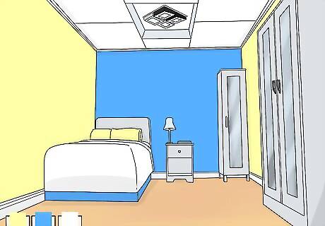 Get paint samples to test directly on the wall. Purchase small samples from a paint supply store. You should test colors for a few days before settling on them. See how the color changes throughout the day, including when you turn on lighting fixtures. This way, you can be sure you love your choices before committing to them. If you don’t want to paint the sample on your wall, apply it to a primed piece of drywall. Otherwise, you can bring home paint swatches and try to use them to make a decision. Give yourself at least a day to live with your colors. The paint will look a little different from day to night, so see if it consistently appeals to you. The type of light in your room affects the paint’s color. Incandescent lighting makes it seem warmer and yellower while fluorescent lighting makes it seem sharper and bluer.