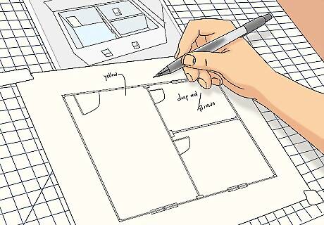 Note which rooms you can see from other rooms. When designing a home’s interior, the goal is to make the rooms feel like they fit together. To do this, the paint colors need to flow together. Walk around your home. Make a floor plan and take notes, remembering that even distant colors affect a room's atmosphere. For instance, if you paint your room with deep reds and browns, a bright orange hallway will detract from it. You may want to paint the hallway a pale yellow so it isn’t a distraction. A simple way to create flowing paint colors is to settle on a theme color. For example, painting trim, bannisters, and furniture white creates consistency even if you paint adjacent rooms different colors. Choose no more than 3-4 colors throughout your house.