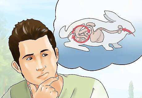 Allow your rabbit to re-ingest its cecotropes, or night feces. In the rabbit, the cecum is huge, 10 times the size of the rabbit's stomach. It is loaded with bacteria and microorganisms that break down plant fibers to make nutrients available to the rabbit's body. When the fibers are broken down, the cecum releases all the nutrients and material into the large intestine in a blob called a cecotrope. This is passed out of the body via the large intestine and anus. When it does, the rabbit eats it to recover the nutrients produced by the bacteria and microorganism in the cecum.