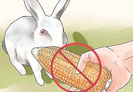Avoid giving your rabbit foods that are bad for it. Now that you know the proper foods to feed a rabbit, you should learn what to never feed a rabbit. Foods that should never be fed to a rabbit, as they may cause severe intestinal upset and may kill a rabbit, include: Human foods other than previously mentioned vegetables and fruits. Corn, seeds, and other grains.