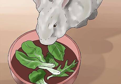 Feed your rabbit leafy green vegetables. Leafy green vegetables, like salad greens, bok choy, arugula, broccoli stems and leaves, and carrot tops are great fiber and water sources for a rabbit. Feed from 1-3 cups a day, depending on the rabbit's size. Make sure to slowly introduce new greens to a rabbit. Introducing new foods to a rabbit too quickly can give it diarrhea, which can be life threatening to a rabbit.