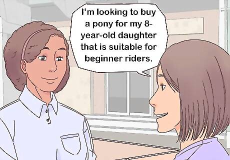 Enquire at your local horse or pony club. This is a great place to buy horses and ponies that are well-trained and have documented riding experience. Ask members if they know anyone selling a horse or post a flyer on a notice board indicating your interest in buying a horse. Be specific about what type of horse you are looking to purchase. For example, “I’m looking to buy a pony for my 8-year-old daughter that is suitable for beginner riders.”