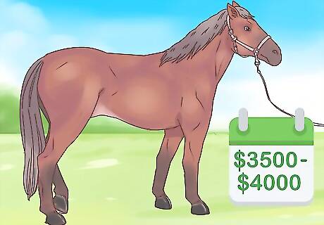 Pick a horse that is within your budget. The initial cost of a horse is only a small percentage of the ongoing costs associated with owning a horse. Make sure that you are able to afford these ongoing costs, such as food, stables, vet bills, and riding accessories, before you purchase a horse. Purebred, registered, and well-trained horses tend to cost more than other horses. If you are looking for a cheaper option, pick an unregistered horse that has a good temperament and has been trained by an experienced owner. Avoid free horses, as these tend to have bad temperaments and will likely cost you more money in the long run. Horses cost approximately $3500-4000 USD per year to keep. Casual riding horses normally cost between $1000 and $10,000 USD.