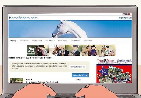 Search online for horses if you want to view a number of horses. There are many online forums that facilitate the buying and selling of horses. Sift through the results until you find a few horses that meet your criteria. Always view potential horses in person before committing to buying them. Otherwise, you may end up with a bad-tempered or injured horse. https://www.horsefinders.com/, https://www.equine.com/, and https://www.horseclicks.com/ are popular online forums for buying horses. Narrow your search to horses in your area to make it easier to view them in person.