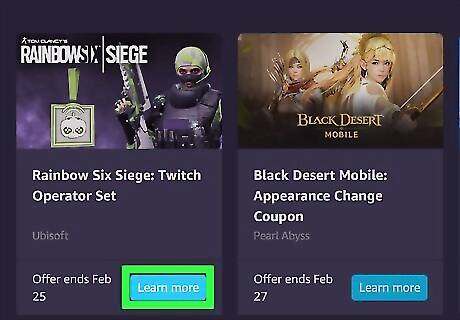 Click the purple Learn More button under a loot. This will redirect you to the selected loot's details on a new page. You can also click Visit the Twitch Prime Loot Page at the top of the window, and see a list of all the available Prime loots on a new page.