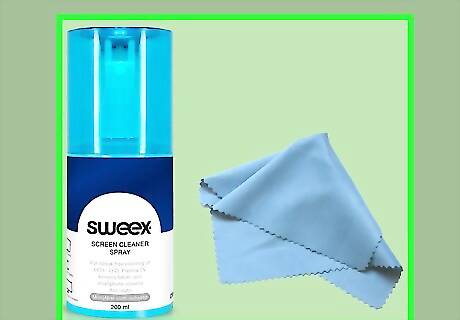 Spray a computer screen cleaner onto a clean microfiber cloth. Only spray the cleaner once or twice to dampen the cloth. Do not soak the cloth. Gently wipe the screen in a circular motion to remove smudges and other marks. Wipe the entire screen until it is free of smudges and marks. You can purchase computer screen cleaners online or at your local office supply store. Avoid scrubbing the screen to remove stubborn marks and smudges.