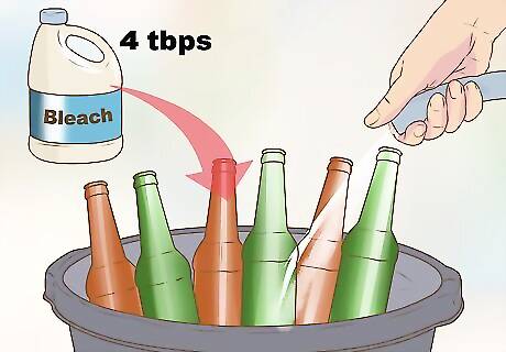 Fill the tub with cold water. Fill the tub until all of the bottles are fully submerged. Then mix in one to four tablespoons (15 to 60 ml) of bleach per gallon of water. Use a mixing spoon or stick to stir and disperse the cleaning solution into the bottles. Alternatively, you can use commercial cleaners like OxyClean or PBW (powder brewery wash). If you use these, fill your tub with hot water as opposed to cold water, and follow the dosing guidelines per the instructions on the product.