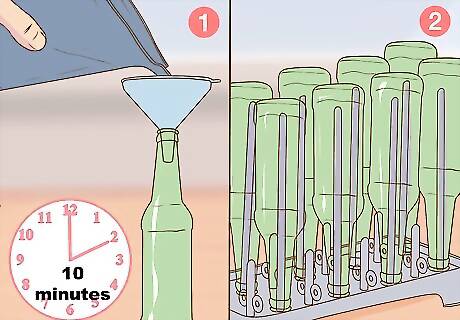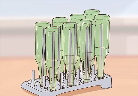 Rinse them with boiled water. Fill a pot with water and place it on the stove. Set the heat to high. Bring the water to a rolling boil, about 8 to 10 minutes. Remove the pot from the heat and let the water cool for five minutes. Rinse each bottle with the water. Then place them upside down a rack to drip dry. Do not use regular, un-boiled tap water to rinse your bottles. The tap water can contaminate your bottles.