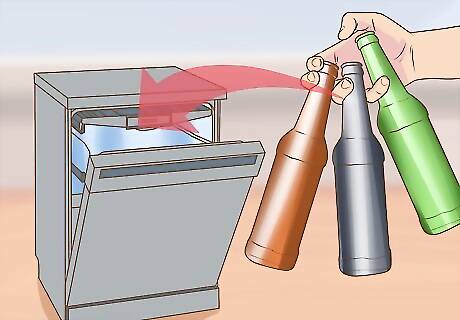 Set your washer on the "sanitize" setting. Make sure the heat cycle is on in order to sanitize the bottles and caps. Let the washer complete the full cycle, including the heat cycle, to ensure that they are sanitized. Do not use any detergent or drying agent like Jet Dry when sanitizing your bottles in the dishwasher. If you do, these will taint the taste of any liquid you fill your beer bottles with. Do not place dirty dishes in the washer while you are sanitizing the beer bottles.