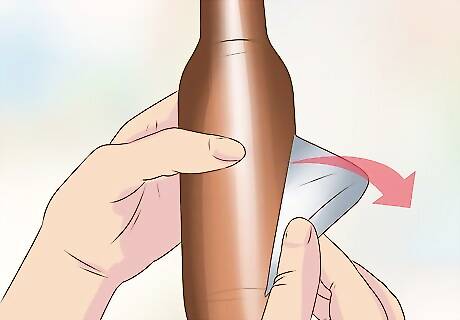 Remove the labels. After the bottles have soaked, you will see the labels beginning to peel off. Put on a pair of protective gloves like nylon gloves. Then begin to slowly peel the labels off. Traces of glue may remain on the bottles after the labels have been peeled off. Use a sponge with an abrasive surface (or a scrub pad) to remove any remaining glue.
