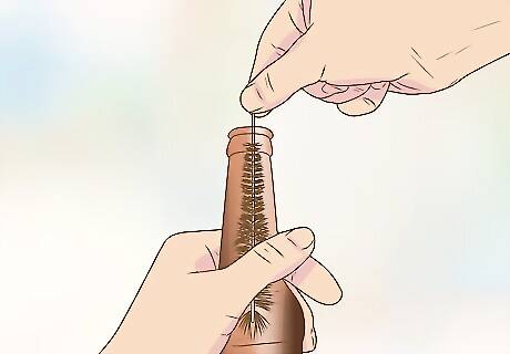 Scrub the inside of the bottles. Use a nylon bottle brush to do this. Fill the bottle with a small amount of the solution. Scrub the inside of the bottle to remove any dirt and grime. Scrub each bottle until all dirt and grime are removed. Hold the bottles up to the light to make sure all of the dirt and grime have been removed. Place the bottles upside down on a drying rack to be sanitized.