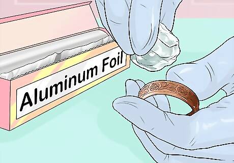 Scrub stains with aluminium foil. First, soak the copper in water for a few minutes. Then ball up one or more pieces of aluminum foil. Scrub over the stained area. If needed, take a break and repeat the process for more stubborn stains that tire you out.