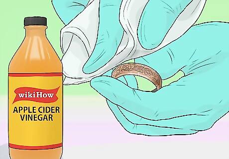 Scrub with apple cider vinegar. Feel free to use other varieties of vinegar if desired. However, expect other kinds to have more acid, which could have an adverse effect on especially delicate copper. Soak a cloth in the vinegar, then scrub the copper. Rinse with clean water and towel dry.