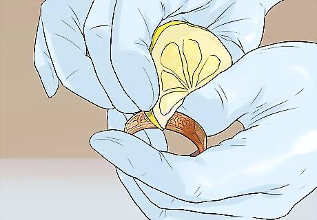 Scrub with lemon slices and salt. Slice a lemon into quarters, thirds, or halves so you can handle them easily. Dip them in salt to add an abrasive agent. Then scrub the copper directly with the lemon slices. Dampen a cloth when finished and wipe the copper clean to reduce the risk of rust. Inspect for any salt particles that have been left behind and remove them. Dry thoroughly.