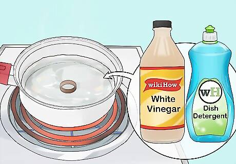 Bring water and cleaning agent to a boil. Fill a pot or pan with water. Add a few squirts of mild dish detergent and/or a generous splash of vinegar. If you're cleaning anything other than a copper pot or pan (or cleaning the outside of a smaller pot or pan), place the item in the water. Set the burner to medium heat and bring to a boil. For heavy build-up of crusted-on materials, substitute the dish soap and vinegar with a cup (221 g) or more of baking soda for a more abrasive cleaning agent. EXPERT TIP Raymond Chiu Raymond Chiu House Cleaning Professional Raymond Chiu is the owner of Maid Sailors Cleaning Service, offering affordable residential and office cleaning services. Since its founding in 2014 in New York City, Maid Sailors has expanded to several cities, including Boston, Chicago, and Austin. The company has earned a reputation as one of the most reliable and best cleaning services in the industry. Raymond Chiu Raymond Chiu House Cleaning Professional Boil a pot of water, one cup of vinegar, and a tablespoon of salt. Drop the item in the pot and let it sit in the solution until the black coating comes off, which can take a while. Remove the object and rinse with water. Then, drop the item in a solution of lemon juice and a tablespoon of salt. Follow up by cleaning with baking soda and water. Rinse and dry the piece.