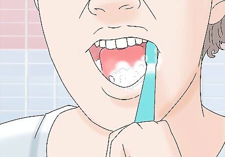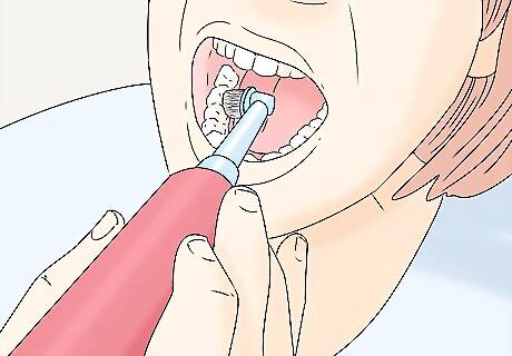Brush the entirety of all your wisdom teeth at least twice daily. Clean your wisdom teeth as part of your general brushing routine: apply a pea-sized amount of toothpaste to your brush; insert the brush at a 45-degree angle along your gumline; brush in a circular motion along the gumline, focusing on 2-3 teeth at a time; brush the inner sides of your teeth with the same circular motion; brush the tops of your molars (including your wisdom teeth), again using a circular motion; rinse and spit with clean water. If you’re using an electric toothbrush, just hold it in place over all surfaces of each tooth. Whether you’re using a manual or electric brush, it should take 2-3 minutes to clean all your teeth. If your wisdom teeth have only partially emerged, clean the exposed portions as well as, if possible, the areas accessible beneath the flap of skin covering them. Don’t cause pain or bleeding by peeling back your gums, though.