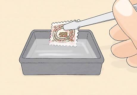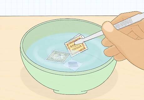 Soak most stamps in lukewarm water. This traditional method works on U.S. stamps from before 2004, and most stamps from other countries. Put the paper-backed stamps in a bowl of lukewarm water, with the stamp face up. Use enough room for each one to float to the surface. After 15–20 minutes, once the stamps have begun to separate from the paper, use your stamp tongs to transfer the stamps to a dry paper towel. Handling the wet stamp very gently, scrape off the remaining paper. If the paper does not come off, let the stamp soak longer. Do not try to peel off the stamp. Stamps on brightly colored paper or with purple ink marks should be soaked in separate bowls, since the ink on the paper might bleed and dye the stamps.