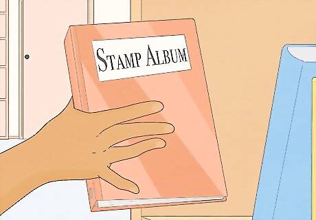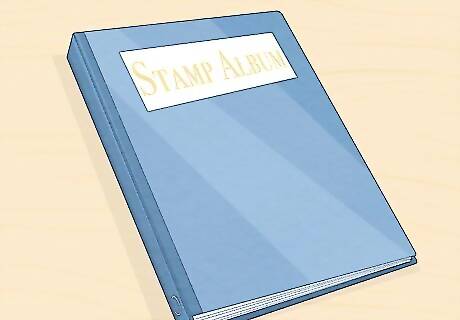 Purchase a stamp album. Stamp albums, or "stock books," protect your stamps from damage and keep them in visible, sorted rows and pages. It is a great way to preserve and organize your stamps. Some of them come with printed images of stamps from a particular country or year, so you can place your stamps over the images as you collect them. Some albums are bound, while others are binders that can have new pages inserted. Black backgrounds tend to display the stamps more clearly.