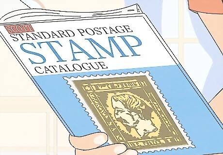 Refer to stamp collector books. Stamp catalogs and price guides are excellent resources, having illustrated lists of stamps, arranged by year, that give a current market value for a given stamp issue. The most widely recognized catalogs are: the Scott Postage Stamp Catalog, Stanley Gibbons for Great Britain issues, Yvert et Tellier for French issues, Unitrade for Canadian issues, and Minkus and Harris US/BNA for United States issues. You can often find these books in a large library, if you don't want to purchase them yourself.