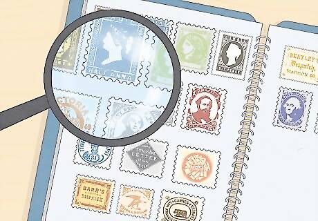 Examine stamps with a magnifying glass. With the designs of many stamp issues only differing by a line or a dot, magnifying glasses are probably the stamp collector's most valued tool. Small jeweler's loops are effective for most hobbyists, but extra valuable or difficult to identify stamps could call for a high-powered magnifying glass with a built-in colored light source.