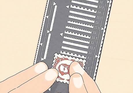 Use a perforation gauge. This tool measures the size of the perforated holes around the edge of the stamp, and is only necessary for advanced stamp collectors. These gauges tell you how many perforations fit in 2 centimeters (0.79 inches), which can greatly affect the price of a valuable stamp. If a stamp guide lists two numbers, such as "Perf 11 x 12," the first number refers to the horizontal perforation and the second number refers to the vertical.
