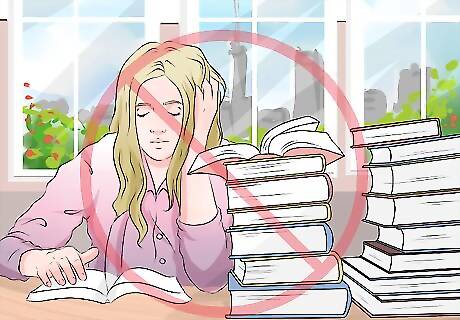 Adopt or maintain a healthy lifestyle. During exam preparation or another stressful scenario, you can ensnare yourself in a vicious cycle. Stress makes it harder for you to sleep and less interested in eating healthy meals, which in turn makes your body more susceptible to stress, which in turn further impairs your sleeping and eating patterns, and so on. A healthy body can manage stress much more effectively, so you must prioritize eating right, sleeping enough, and exercising often. As a teen, set aside 8-10 hours for sleep each night. Adequate sleep gives you energy, focus, and a positive outlook, while inadequate sleep increases your stress hormone levels. Eat healthy, balanced meals, with lots of fresh fruits and vegetables, lean proteins, and whole grains. This will provide steady energy and focus. Resist the temptation for supposed “comfort foods” like sugary drinks or fatty fast food. These will provide only a temporary boost, followed by a crash. See this wikiHow article for more on making healthy choices and other ways to reduce stress as a teen.