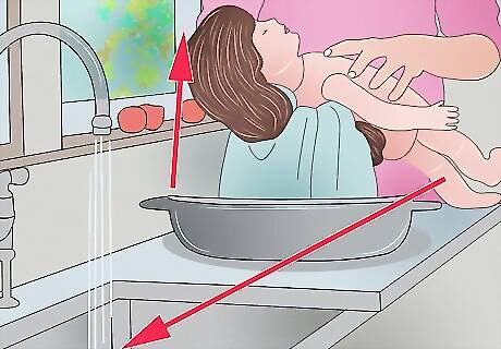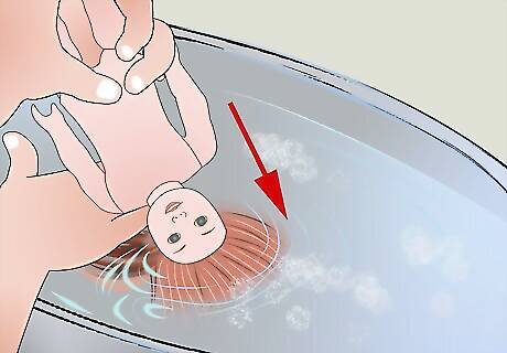 Remove the doll. Take the doll out of the casserole dish and transfer her to a sink. Gently rinse the solution out of the doll’s hair, making sure to keep the doll’s face and body dry.