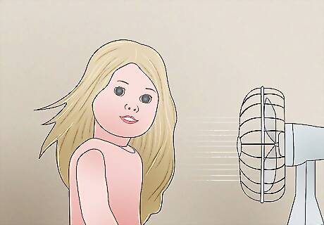 Allow hair time to air dry. Once the doll’s hair has been thoroughly rinsed, dry the hair either by leaving the doll out overnight, or by placing the doll in front of a fan gently blowing cool air. Be careful not to set the doll down directly in front of the fan, as this can cause the hair to tangle. When drying your American Girl doll’s hair, never apply heat through blow drying, curling or straightening. This will cause the hair fibers to dry, stiffen, frizz or melt.