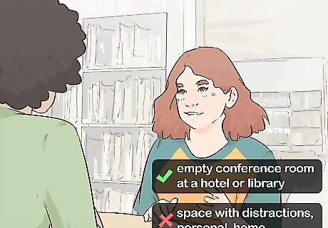 Choose a setting where both you and the interviewee are comfortable. Meet to conduct the interview in a neutral space. Try to avoid a space with distractions, such as a room next to a busy highway. For example, schedule the interview for an empty conference room at a hotel or library, rather than asking the subject to come to your home. If you’re conducting the interview over the phone, find a time when you and the interviewee are both free.