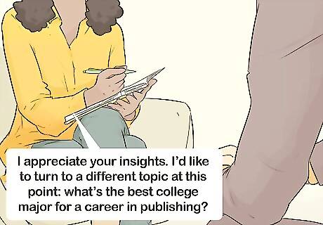 Guide the interview along the sequence of questions you’ve planned. Bear in mind that you’re in charge of the pace and direction of the interview. If the conversation is moving too slowly, or if you’re ready to move on to, don’t hesitate to bring up the next question. The pacing of the interview is especially important when conducting research, since in some settings, you’ll need to interview multiple individuals in a small amount of time. If the interviewee lingers too long on a specific question, try moving things along. Say something like, “I appreciate your insights. I’d like to turn to a different topic at this point: what’s the best college major for a career in publishing?”