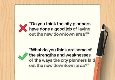 Craft questions that will generate more than a yes or no answer. In order to elicit articulate, thorough responses from your interviewee, give them open-ended questions that allow them to elaborate and provide their thoughts on the issue. Avoid asking simple questions that can be answered with a single word. Good introductory phrases for open-ended questions include “What do you think …” “Say more about …” or “What would you suggest … .” For example, if you ask something like, “Do you think the city planners have done a good job of laying out the new downtown area?” the subject can just answer “yes” or “no.” Instead, ask, “What do you think are some of the strengths and weaknesses of the ways the city planners laid out the new downtown area?”