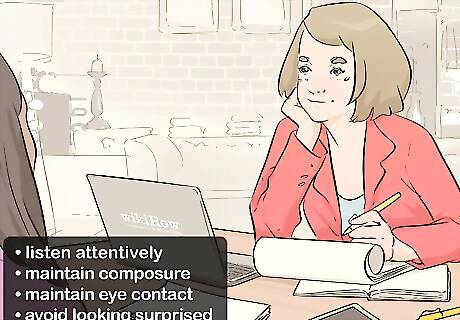 Listen attentively and maintain composure as the interviewee speaks. Show that you’re engaged with and interested in what the interviewee is saying by maintaining good eye contact and reacting verbally to their major points. That said, avoid looking surprised or giving away a personal bias. This kind of behavior could influence the interviewee to change their response, diminishing the objectivity of the interview. For example, even if the interviewee says something surprising like: “I think it’s good that the frogs are dying!” avoid jumping up or shouting “What!?”